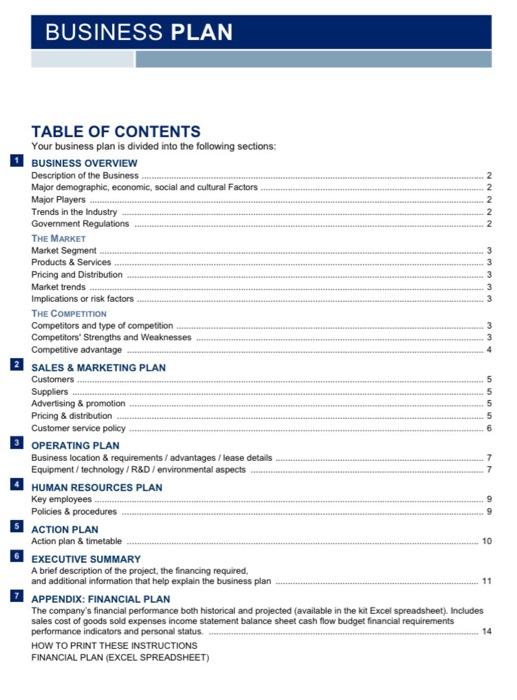 Business plan table of contents. Creating a business plan also gives your business focus so you can put all the puzzle pieces together and create a strategy and plan for how the company is going to succeed. A business plan that is precisely designed should be so good that it should be preferred in the very first look is a quintessential doc when it is with respect to either equity or debt financing. Adapted from guide to writing a business plan here are some of the most common writing mistakes: The company's competitiveness rests on the founder's experience, business skills, relationships, and enthusiasm. Business plans usually consist of eight (8) sections as itemized below: A business plan should follow a standard format and contain all the important business plan elements. The table of contents and table of appendices should refer the reader to the sections and subsections of the business plan. • use visual aids—graphs, exhibits, and tabular summaries. Für fördermittel, finanzierungen & zuschüsse. Typically, it should present whatever information an investor or financial institution expects to see before providing financing to a business. • the owners' names and their credentials • your products or services Business plan table of contents are began with the goal of giving them to bigger players in the business.